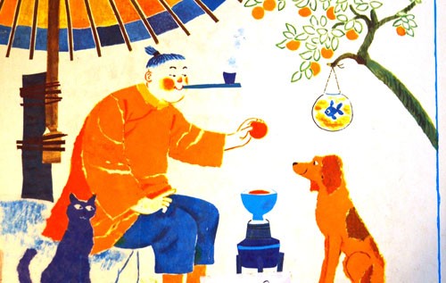 Cion Cion Blu era un contadino che viveva sotto un ombrello tutto arancione, dormiva in letto tutto blu, aveva vestiti solo di colore blu e arancione. Cion aveva un gatto blu che si chiamava Arancion, un cane arancione che si chiamava Blu e un pesciolino blu che si chiamava Bluino e nuotava solo nell’aranciata.