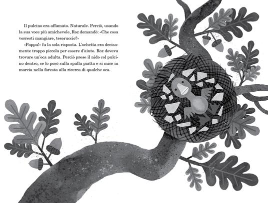 Un giorno, durante una forte tempesta Roz corre giù da un pendio e per errore abbatte un albero. Passata la tempesta Roz si accorge di aver fatto più danni di quel che pensava e trova due oche morte e qualche uovo rotto. Ci rimane male, ma osservando le foglie trova un uovo ancora intatto e lo porta con se per farlo sopravvivere. Quando l’uovo si schiude gli animali le dicono che l’ochetta morirà perché è piccola e minuta, ma alla fine tutti la aiutano a diventare una buona madre.
